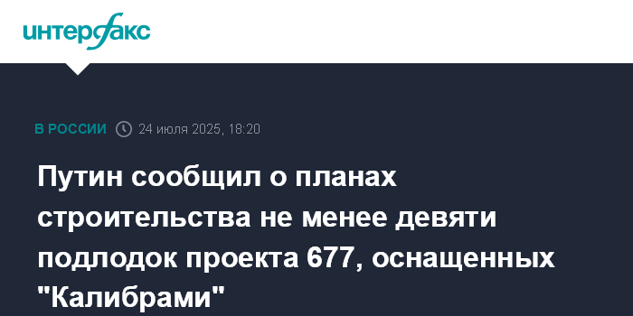 Москва. 24 июля. INTERFAX.RU - Планируется строительство не менее девяти неатомных подлодок проекта 677 "Лада", оснащенных ракетами "Калибр", заявил президент Владимир Путин на совещании по стратегии развития подводных сил ВМФ.