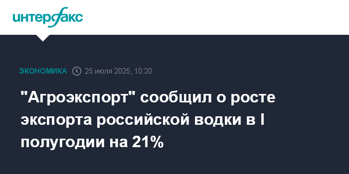 Москва. 25 июля. INTERFAX.RU - Россия в первом полугодии 2025 года экспортировала 16 тысяч тонн водки почти на $25 млн, сообщает федеральный центр "Агроэкспорт" со ссылкой на оценки экспертов.