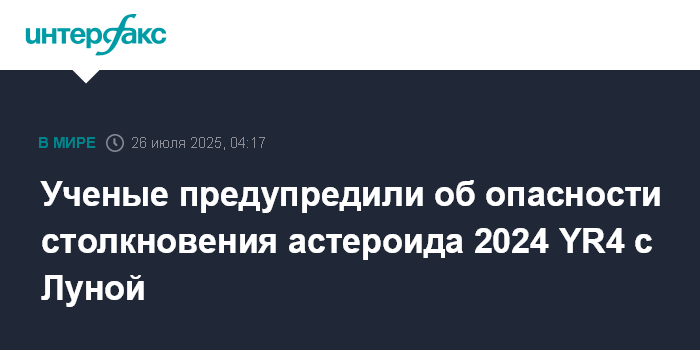 Москва. 26 июля. INTERFAX.RU - Астероид 2024 YR4 может столкнуться с Луной в 2032 году. Это вызовет выброс до 100 тыс. т лунной породы, которая повредит спутники и другие аппараты на орбите Земли. Об этом сообщает телеканал CNN, ссылаясь на ученых Корнеллского университета.