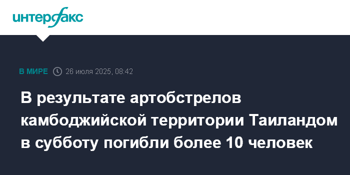 Москва. 26 июля. INTERFAX.RU - Более 10 человек погибли, свыше 70 ранены в результате артиллерийского обстрела Таиландом ряда районов в Камбодже, сообщила газета Khmer Times со ссылкой на данные представителя камбоджийского минобороны Мали Сочеат.