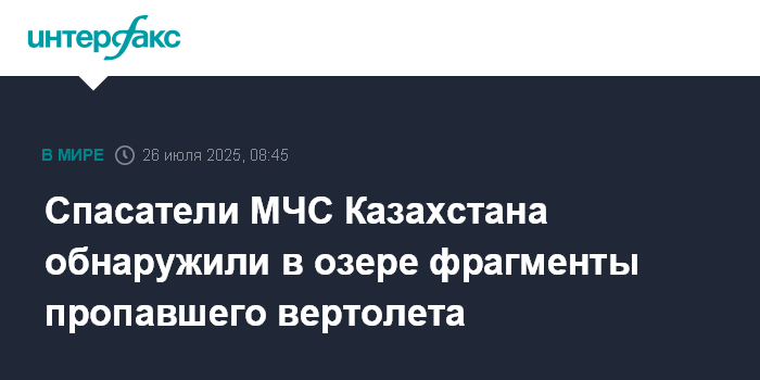 Москва. 26 июля. INTERFAX.RU - В акватории озера Сорбулак Алматинской области Казахстана обнаружены фрагменты вертолета, пропавшего в минувшую пятницу с радаров, сообщила в субботу пресс-служба МЧС республики.