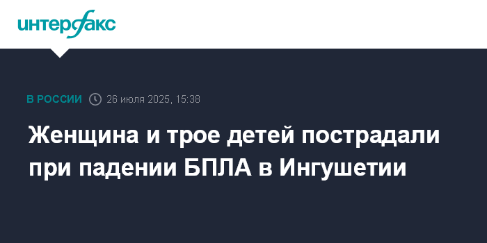 Москва. 26 июля. INTERFAX.RU - После падения украинского беспилотника в селении Нижние Ачалуки Ингушетии к медикам доставили женщину и троих детей, сообщает Минздрав республики в субботу.