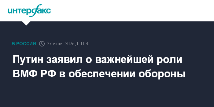 Москва. 27 июля. INTERFAX.RU - Военно-морской флот России способен решать любые поставленные перед ним задачи, и будет оперативно адаптироваться к любым изменениям стратегической обстановки, заявил президент РФ Владимир Путин.