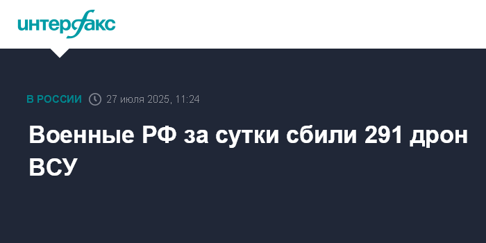Москва. 27 июля. INTERFAX.RU - Минобороны РФ сообщило, что за сутки российскими военными сбит 291 украинский беспилотник самолетного типа.