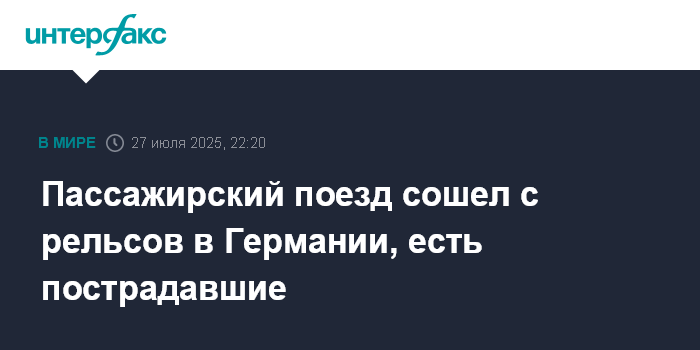 Москва. 27 июля. INTERFAX.RU - Пассажирский поезд сошел с рельсов на юго-западе Германии, несколько человек пострадали, сообщают в воскресенье немецкие СМИ со ссылкой на источники в органах безопасности.