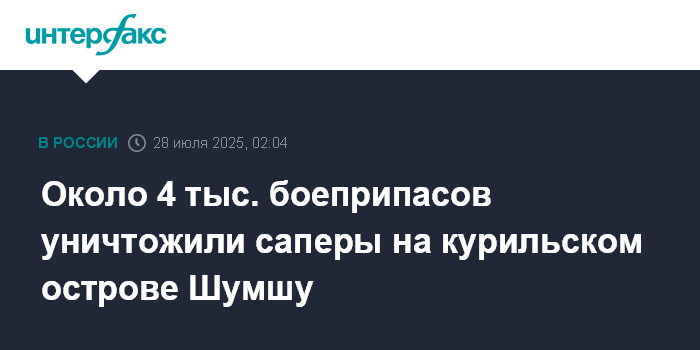 Москва. 28 июля. INTERFAX.RU - Военнослужащие сводного отряда разминирования армейского корпуса Восточного военного округа (ВВО) нашли и уничтожили более 3,8 тыс. боеприпасов времен Второй мировой войны за два месяца своей работы на острове Шумшу (Северные Курилы Сахалинской области), сообщает пресс-служба ВВО.
