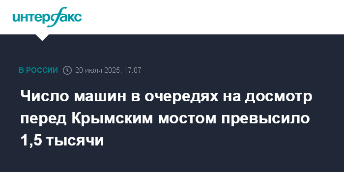 Москва. 28 июля. INTERFAX.RU - Проезда через досмотровые пункты на Крымском мосту в понедельник вечером ожидают 1585 автомобилей, сообщили в инфоцентре, освещающем ситуацию на автомобильных подходах к мосту.