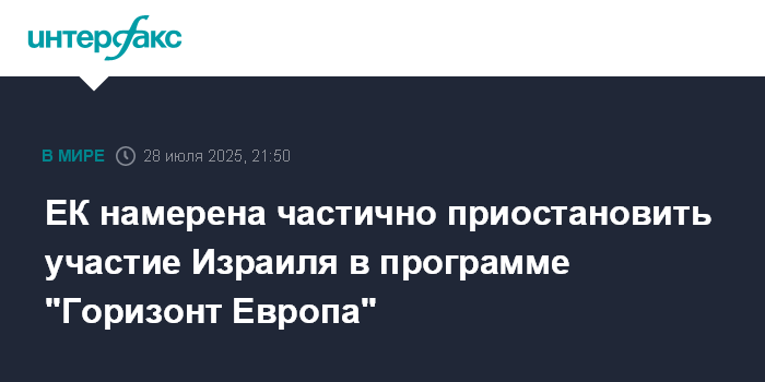 Москва. 28 июля. INTERFAX.RU - Еврокомиссия (ЕК) выдвинула предложение частично приостановить участие Израиля в программе ЕС в области исследований и инноваций "Горизонт Европа" (Horizon Europe) из-за ситуации в Газе.