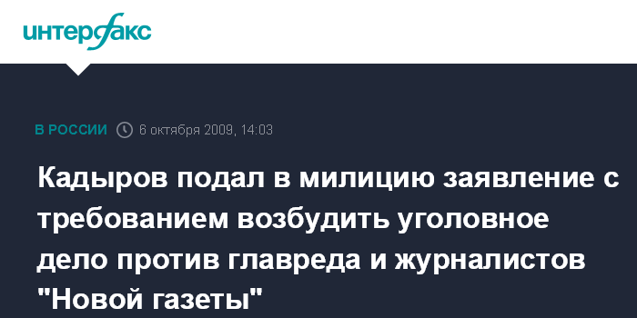 Кадыров подал в милицию заявление с требованием возбудить уголовное дело против главреда и журналистов "Новой газеты"