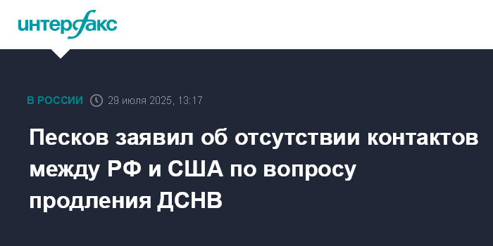 Москва. 29 июля. INTERFAX.RU - Контактов между Москвой и Вашингтоном по продлению ДСНВ не ведется, заявил пресс-секретарь президента РФ Дмитрий Песков.