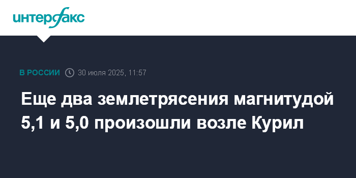 Москва. 30 июля. INTERFAX.RU - Сейсмологи зарегистрировали два землетрясения магнитудой 5,1 и 5,0, произошедшие в Тихом океане близ Курильских островов вечером в среду по местному времени, сообщили "Интерфаксу" в Сахалинском филиале Единой Геофизической службы РАН.