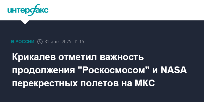 Москва. 31 июля. INTERFAX.RU - Программу перекрестных полетов на Международную космическую станцию (МКС) между "Роскосмосом" и NASA важно продолжать, заявил заместитель гендиректора госкорпорации по пилотируемым программам Сергей Крикалев.