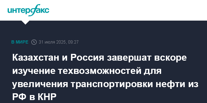 Москва. 31 июля. INTERFAX.RU - Казахстан и Россия в ближайшее время завершат изучение технических возможностей для увеличения транспортировки российской нефти в КНР через территорию Казахстана, сообщил министр энергетики этой страны Ерлан Аккенженов на пресс-конференции в четверг в Астане.