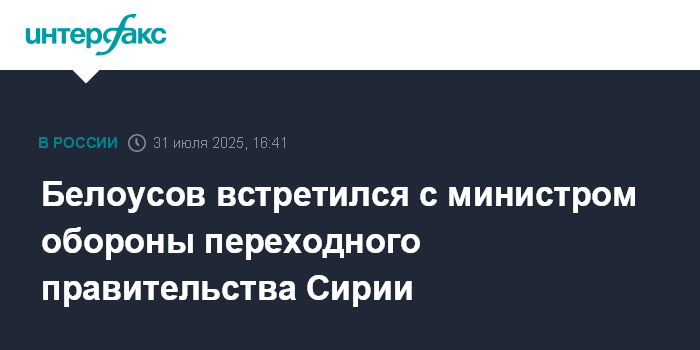 Москва. 31 июля. INTERFAX.RU - Министр обороны РФ Андрей Белоусов провел встречу с министром обороны переходного правительства Сирийской Арабской Республики дивизионным генералом Мархафом Абу Касром, сообщило российское военное ведомство.
