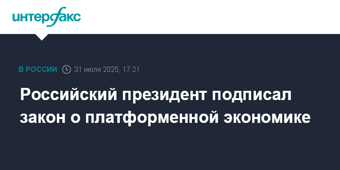 Москва. 31 июля. INTERFAX.RU - Президент РФ Владимир Путин подписал федеральный закон о регулировании платформенной экономики. Документ размещен на портале официального опубликования правовых актов.