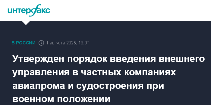 Такой порядок введения внешнего управления в компаниях авиапрома и судостроения будет действовать в условиях военного положения, объяснил Минпромторг.