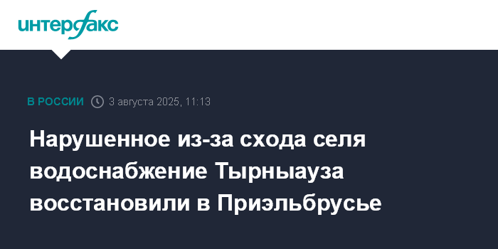 Москва. 3 августа. INTERFAX.RU - Специалисты восстановили подачу воды жителям города Тырныауза в Эльбрусском районе Кабардино-Балкарии, где сошел селевой поток, сообщает пресс-служба регионального ГУ МЧС в воскресенье.