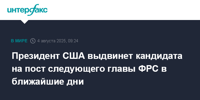 Москва. 4 августа. INTERFAX.RU - Президент США Дональд Трамп выдвинет своего кандидата на пост следующего председателя Федеральной резервной системы (ФРС) в ближайшие дни.