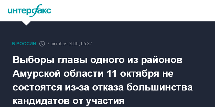Благовещенск. 7 октября. ИНТЕРФАКС-ДАЛЬНИЙ ВОСТОК - Выборы главы Тамбовского района Амурской области, которые должны были пройти в единый день голосования 11 октября, не состоятся из-за отказа от участия в них троих из четырех зарегистрированных кандидатов.
