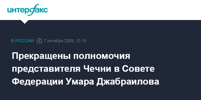 Москва. 7 октября. INTERFAX.RU - Совет Федерации на заседании в среду досрочно прекратил полномочия члена верхней палаты Умара Джабраилова, который в течение последних шести лет представлял в верхней палате исполнительную власть Чеченской республики.