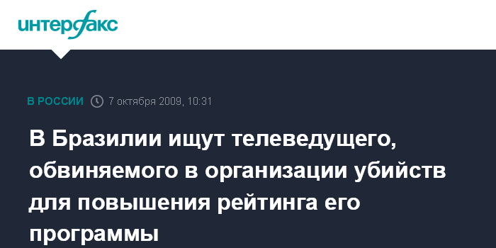 Москва. 7 октября. INTERFAX.RU - Ведущий криминальной программы на бразильском телевидении, обвиняемый в организации преступлений для поднятия рейтинга своей передачи, скрылся после того, как суд выдал ордер на его арест, сообщает британская телерадиокорпорация Би-би-си со ссылкой на заявление представителей бразильской полиции. В настоящее время сотрудники правоохранительных органов проверяют все аэропорты и дороги, ведущие из города Манаус в штате Амазонас.