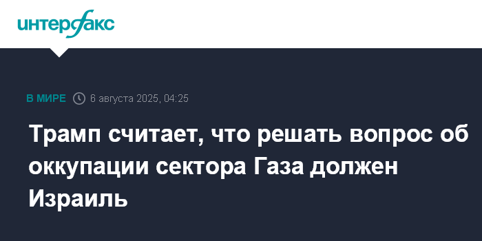 Москва. 6 августа. INTERFAX.RU - Решение вопроса о полной оккупации сектора Газа должно оставаться за Израилем, заявил президент США Дональд Трамп.