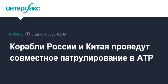 Москва. 6 августа. INTERFAX.RU - Тихоокеанский флот РФ сообщил, что корабли России и Китая после учения в Японском море готовятся к совместному патрулированию в Азиатско-Тихоокеанском регионе.