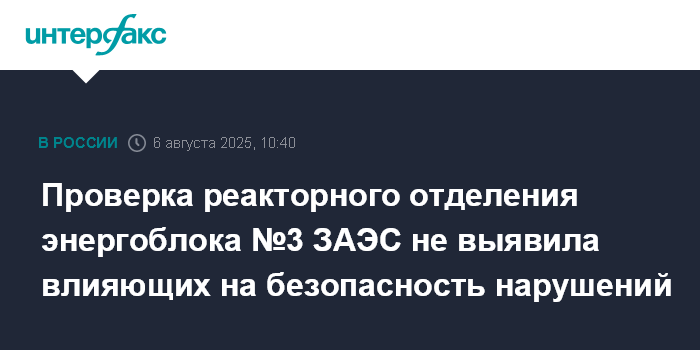 Москва. 6 августа. INTERFAX.RU - Специалисты Ростехнадзора и МАГАТЭ проверили оборудование в реакторном отделении энергоблока №3 Запорожской АЭС, сообщили в среду представители станции.