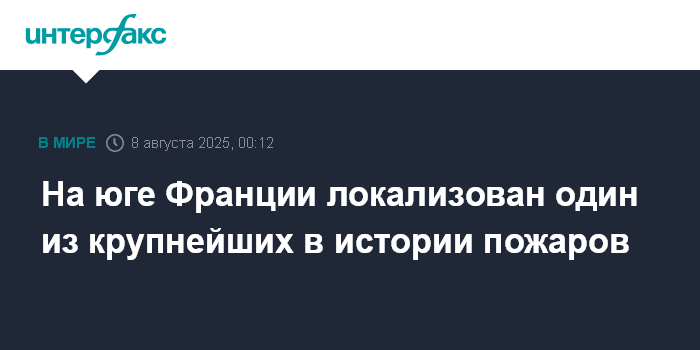 Москва. 8 августа. INTERFAX.RU - Самый гигантский минимум за 50 лет на французском побережье Средиземного моря пожар в департаменте Од к вечеру четверга удалось локализовать, сообщает Le Figaro.