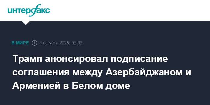"Президент Алиев и премьер-министр Пашинян присоединятся ко мне в Белом доме на официальной церемонии подписания мирного соглашения", - написал Трамп в соцсети The Truth Social.