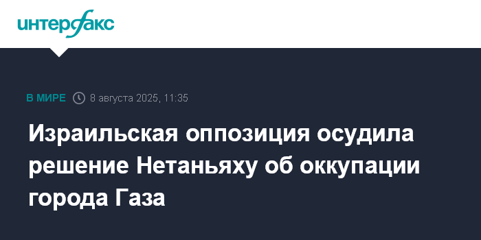 Москва. 8 августа. INTERFAX.RU - Израильские оппозиционеры выступили против плана правительства по взятию под полный контроль города Газа, заявив, что это приведет к гибели израильских заложников.