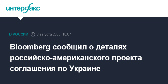 Москва. 8 августа. INTERFAX.RU - США и Россия намерены заключить соглашение по украинскому урегулированию, по условиям которого за Россией, среди прочего, останутся занятые территории, сообщает Bloomberg со ссылкой на источники.