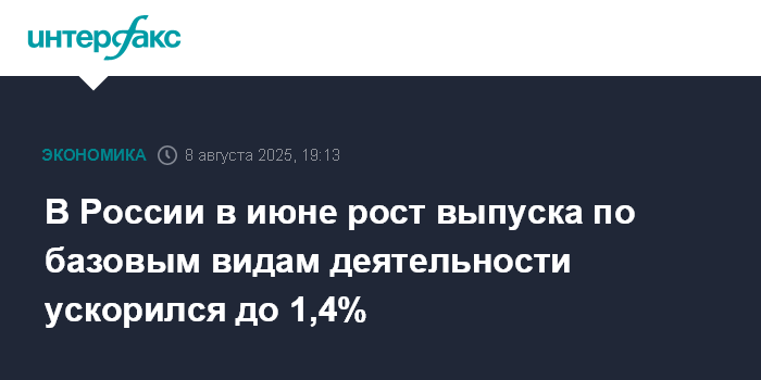 Москва. 8 августа. INTERFAX.RU - В России в июне выпуск продукции и услуг по базовым видам экономической деятельности вырос на 1,4% в годовом выражении после роста на 0,8% в мае (оценка уточнена с 0,7%), 2% в апреле, на 0,8% в марте, на 0,5% в феврале и на 3,0% в январе 2025 года, сообщил Росстат.