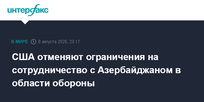 Москва. 8 августа. INTERFAX.RU - Президент США Дональд Трамп в пятницу объявил об отмене ограничений на сотрудничество в сфере обороны между Вашингтоном и Баку.