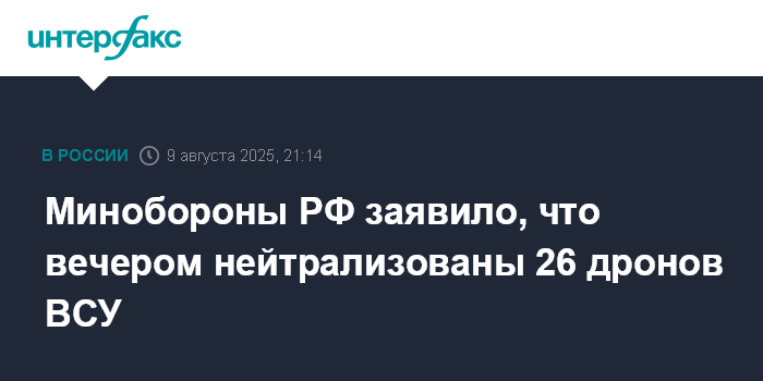 Москва. 9 августа. INTERFAX.RU - Минобороны РФ сообщило, что с 18:00 до 20:00 по Москве над российскими регионами перехвачены и уничтожены 26 украинских беспилотников.