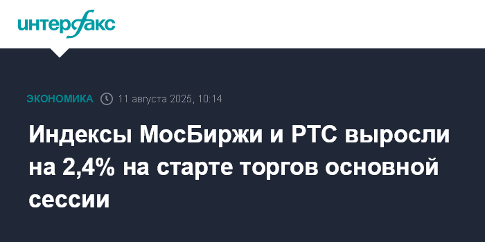 Москва. 11 августа. INTERFAX.RU - Рынок акций РФ на старте торгов основной сессии на МосБирже в понедельник растет на ожиданиях личной встречи президентов России и США для обсуждения мирного урегулирования конфликта вокруг Украины, которая пройдет 15 августа на Аляске, а также на фоне улучшения внешней фондовой конъюнктуры. Сдерживающим фактором для покупателей выступает проседающая нефть (фьючерс на Brent опустился ниже $66 за баррель). Индексы МосБиржи и РТС за минуту торгов прибавили по 2,4%, лидируют в росте акции "Юнипро" (+9,8%), "Эн+ груп" (+5,9%), ОК "Русал" (+5,4%).