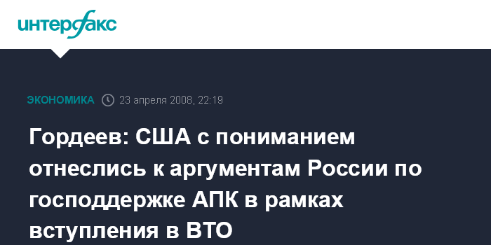 Гордеев: США с пониманием отнеслись к аргументам России по господдержке АПК в рамках вступления в ВТО
