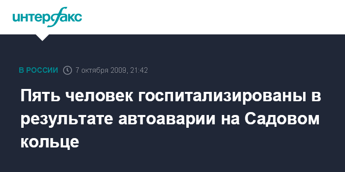 Москва. 7 октября. INTERFAX.RU - Серьезное ДТП произошло вечером в среду в российской столице, пятеро пострадавших госпитализированы в НИИ имени Склифосовского, сообщил "Интерфаксу" источник в правоохранительных органах столицы.