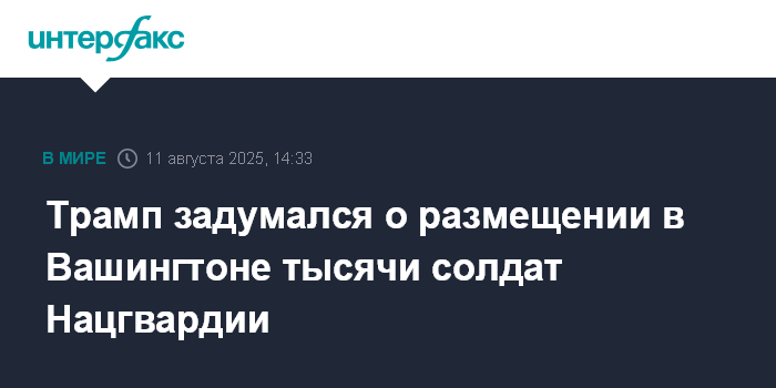 Москва. 11 августа. INTERFAX.RU - Президент США Дональд Трамп изучает вариант с размещением на территории Вашингтона, округ Колумбия, до 1 тысячи солдат Нацгвардии для обеспечения безопасности в городе и решения проблем с преступностью, сообщает NBC со ссылкой источника в военной сфере и двух чиновников.