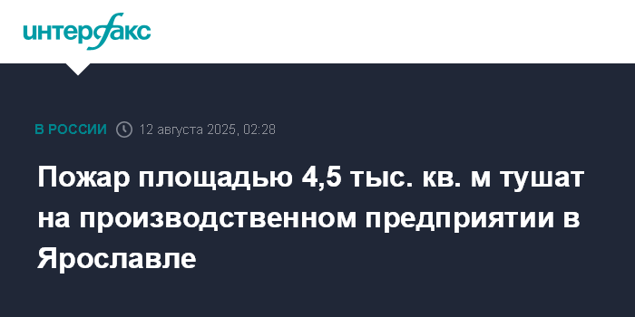 Москва. 12 августа. INTERFAX.RU - Производственное предприятие горит в Ярославле на 4 тыс. 500 кв. м., обрушилась кровля, сообщает пресс-служба МЧС России во вторник.