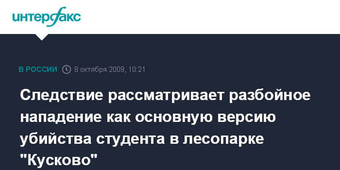Москва. 8 октября. INTERFAX.RU – В качестве основной версии убийства студента в лесопарке "Кусково" в Москве рассматривается корыстная цель - хищение чужого имущества, сообщили "Интерфаксу" столичном управлении СКП РФ.