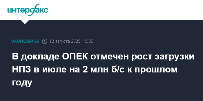 В докладе ОПЕК отмечен рост загрузки НПЗ в июле на 2 млн б/с к прошлом году
