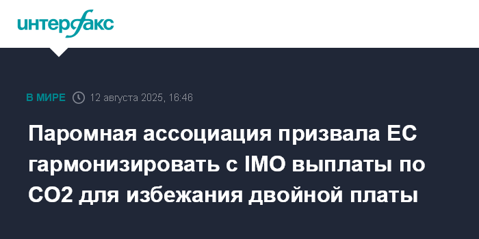 Москва. 12 августа. INTERFAX.RU - Международная паромная ассоциация Interferry призывает Европейскую комиссию гармонизировать свои односторонние правила по оплате выбросов с недавно согласованной программой Международной морской организации International Maritame Organization, IMO) Net-Zero для предотвращения двойных платежей.