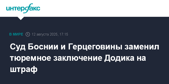 Москва. 12 августа. INTERFAX.RU - Суд Боснии и Герцеговины удовлетворил ходатайство адвокатов президента Республики Сербской Милорада Додика и заменил назначенное ему тюремное заключение на денежный штраф, сообщает РТС.