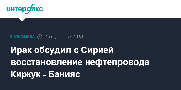 Москва. 12 августа. INTERFAX.RU - Глава Миннефти Ирака Хайян Абдул-Гани и министр энергетики Сирии Мухаммад Башир обсудили восстановление работы нефтепровода Киркук - Банияс, который позволил бы Ираку диверсифицировать рынки сбыта нефти и возобновить ее поставки через Средиземное море, сообщило Министерство нефти Ирака.