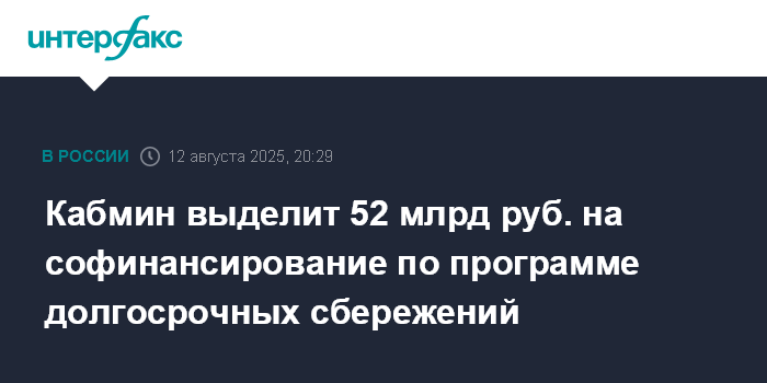 Москва. 12 августа. INTERFAX.RU - Правительство РФ в 2025 году выделит около 52 млрд рублей на софинансирование взносов по программе долгосрочных сбережений (ПДС), заявил премьер-министр Михаил Мишустин.