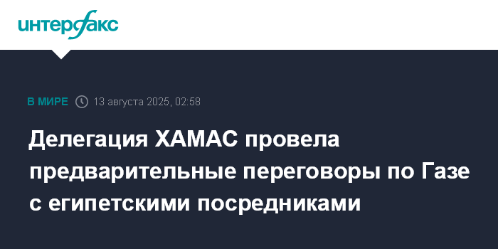Москва. 13 августа. INTERFAX.RU - Делегация палестинского движения ХАМАС и египетские посредники во вторник в Каире обсудили вопросы, касающиеся возобновления переговоров о заложниках, сообщила The Times of Israel, ссылаясь на дипломатический источник.