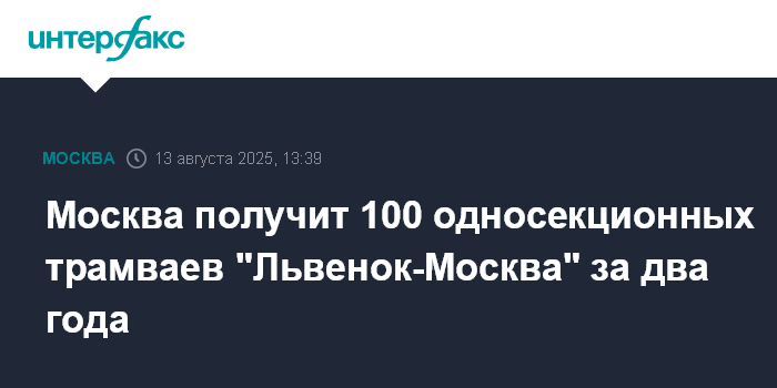 Москва. 13 августа. INTERFAX.RU - В столицу поступил первый односекционный трамвай "Львенок-Москва" новой поставки; в течение 2025-2026 гг. город получит 100 таких вагонов, сообщил мэр Москвы Сергей Собянин.