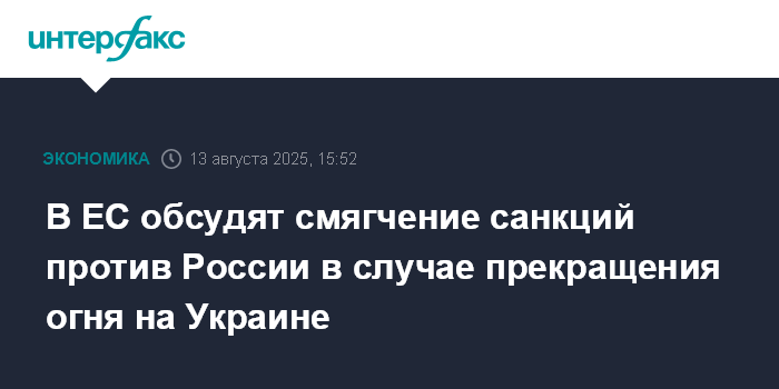 Москва. 13 августа. INTERFAX.RU - Евросоюз оценивает возможность последовательного ослабления санкций против России в случае достижения соглашения о прекращении огня на Украине, сообщает Sky News со ссылкой на источники.