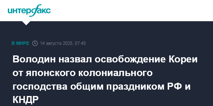 Москва. 14 августа. INTERFAX.RU - Председатель Госдума Вячеслав Володин заявил, что 80-летие освобождения Кореи от японского колониального господства - общий праздник для России и КНДР, который представляет собой доказательство длительных взаимоотношений стран.